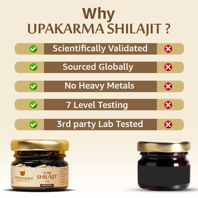 Natural Shilajit contains Fulvic acid, Humins, and Humic Acids, which have antibacterial and antiviral properties. The ultimate culmination is a perfect blend of essential minerals and nutrients to restore your balance. Upakarma Ayurveda’s natural Shilajit will keep you one step ahead by detoxifying the mind and will equip your body to deal with your lifestyle.
